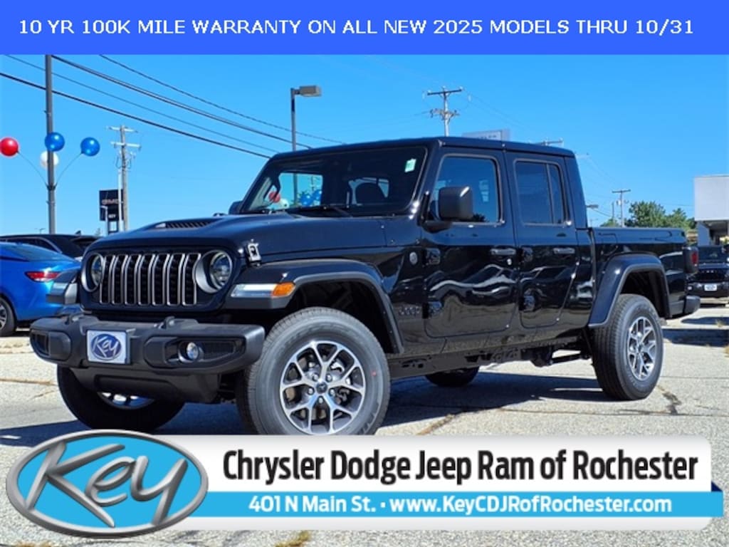 Key Chrysler Dodge Jeep Ram of Rochester is proud to present you with another True Market Priced Vehicle. This 2025 Jeep Gladiator Sport is loaded with the following Factory Options: Convenience Group (Corning Gorilla Glass, Daytime Running Lamp System, Emergency/Assistance Call, Front Door Locks 2-Door Passive Entry, Heated Front Seats, Heated Steering Wheel, Remote Start System, and Universal Garage Door Opener), Dark Sky Appearance Package (Body Color Fender Flares (2-Piece), Mold In Color Bumper w/Gloss Black, and Performance Hood), LED Headlamp & Fog Lamp Group (Daytime Running Lamps LED Accents, Front LED Fog Lamps, and LED Premium Reflector Headlamps), Quick Order Package 24S Sport S (Advanced Brake Assist, Automatic Headlamps, Deep Tint Sunscreen Windows, Enhanced Adaptive Cruise Control, Full Speed Forward Collision Warning Plus, Normal Duty Plus Suspension, Power Heated Mirrors, Premium Wrapped Steering Wheel, Security Alarm, Sun Visors w/Illuminated Vanity Mirrors, and Wheels: 17" x 7.5" Gray), 110 MPH Vehicle Max Speed Calibration, 12.3" Touchscreen Display, 3.73 Rear Axle Ratio, 4-Wheel Disc Brakes, 4G LTE Wi-Fi Hot Spot, 8 Speakers, ABS brakes, Air Conditioning, Alexa Built-In, AM/FM radio: SiriusXM, Apple CarPlay, Apple CarPlay/Android Auto, Body Color 3-Piece Hard Top, Brake assist, Cloth Low-Back Bucket Seats, Compass, Connectivity - US/Canada, Delay-off headlights, Driver door bin, Driver vanity mirror, Dual front impact airbags, Dual front side impact airbags, Electronic Stability Control, Freedom Panel Storage Bag, Front anti-roll bar, Front Bucket Seats, Front Center Armrest w/Storage, Front fog lights, Front License Plate Bracket, Front reading lights, Google Android Auto, Illuminated entry, Integrated roll-over protection, Low tire pressure warning, MOPAR All-Weather Slush Mats, Normal Duty Suspension, Occupant sensing airbag, Outside temperature display, Overhead airbag, Panic alarm, ParkView Rear Back-Up Camera, Passenger door bin, Passenger vanity mirror, Power steering, Power windows, Radio data system, Radio: Uconnect 5 w/12.3" Display, Rear anti-roll bar, Rear reading lights, Rear Sliding Window, Rear Window Defroster, Remote keyless entry, Speed control, Split folding rear seat, Steering wheel mounted audio controls, Tachometer, Telescoping steering wheel, Tilt steering wheel, Traction control, Trip computer, USB Host Flip, Variably intermittent wipers, Voltmeter, Wheels: 17" x 7.5" Black Steel Styled, and Wheels: 17" x 7.5" Machined w/Black Pockets!! Call us to ask about conditional rebates. Price includes: $2000 - 2025 National Overaged Select Inventory Bonus Cash. Exp. 11/03/2025 $2250 - 2025 National Bonus Cash . Exp. 11/03/2025