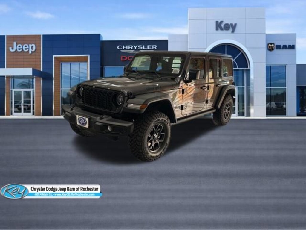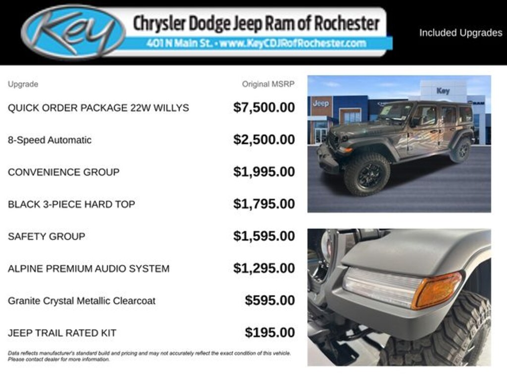 Key Chrysler Dodge Jeep Ram of Rochester is proud to present you with another True Market Priced Vehicle. This 2025 Jeep Wrangler Willys is loaded with the following Factory Options: Convenience Group (2-Door Passive Entry, Front Door Locks, Air Conditioning w/Auto Temperature Control, Air Filtering, Cluster 7.0" TFT Color Display, Emergency/Assistance Call, Heated Front Seats, Heated Steering Wheel, Remote Start System, and Universal Garage Door Opener), Quick Order Package 22W Willys (4-Wheel Drive Swing Gate Decal, 7 & 4 Pin Wiring Harness, 97 MPH Vehicle Max Speed Calibration, Advanced Brake Assist, Automatic Headlamps, Auxiliary Switches, Black Grille, Class II Receiver Hitch, Conventional Differential Front Axle, Corning Gorilla Glass, Dana M210 Wide HD Tube Front Axle, Dana M220 Wide Rear Axle, Daytime Running Lamps LED Accents, Deep Tint Sunscreen Windows, E-Locker Rear Axle, Enhanced Adaptive Cruise Control, Front LED Fog Lamps, Full Speed Forward Collision Warning Plus, Injection Molded Black Rear Bumper, LED Premium Reflector Headlamps, Mold In Color Bumper w/Gloss Black, Molded in Color Rubicon Highline Flare, MOPAR All-Weather Floor Mats, Off-Road Plus Mode, Power Heated Mirrors, Premium Wrapped Steering Wheel, Security Alarm, Sun Visors w/Illuminated Vanity Mirrors, Wheels: 17" x 7.5" Painted Black, Willy's Suspension, and Willys Hood Decal), Safety Group (Auto High Beam Headlamp Control, Blind Spot & Cross Path Detection, LED Taillamps, and ParkSense Rear Park Assist System), 110 MPH Vehicle Max Speed Calibration, 4-Wheel Disc Brakes, 8 Speakers, ABS brakes, Air Conditioning, Alpine Premium Audio System, AM/FM radio: SiriusXM, Apple CarPlay/Android Auto, Aux Battery, Black 3-Piece Hard Top, Brake assist, Cloth Low-Back Bucket Seats, Compass, Delay-off headlights, Driver door bin, Driver vanity mirror, Dual front impact airbags, Dual front side impact airbags, Electronic Stability Control, Freedom Panel Storage Bag, Front anti-roll bar, Front Bucket Seats, Front Center Armrest w/Storage, Front fog lights, Front reading lights, Illuminated entry, Integrated roll-over protection, Jeep Trail Rated Kit, Low tire pressure warning, Non-Lock Fuel Cap w/o Discriminator, Normal Duty Suspension, Occupant sensing airbag, Outside temperature display, Overhead airbag, Panic alarm, ParkView Rear Back-Up Camera, Passenger door bin, Passenger vanity mirror, Power steering, Power windows, Radio data system, Radio: Uconnect 5 w/12.3" Display, Rear anti-roll bar, Rear reading lights, Rear Window Defroster, Rear Window Wiper/Washer, Remote keyless entry, Speed control, Split folding rear seat, Steering wheel mounted audio controls, Stop-Start Dual Battery System, Tachometer, Telescoping steering wheel, Tilt steering wheel, Traction control, Trip computer, Variably intermittent wipers, and Wheels: 17" x 7.5" Black Steel Styled!! Call us to ask about conditional rebates. Price includes: $2500 - 2025 National Retail Bonus Cash . Exp. 03/31/2026 $3500 - 2025 National Bonus Cash . Exp. 03/31/2026