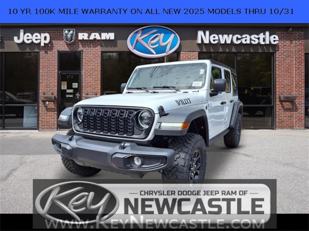 Key Chrysler Dodge Jeep Ram Newcastle is proud to present you with another True Market Priced Vehicle. This 2025 Jeep Wrangler Willys is loaded with the following Factory Options: Convenience Group (2-Door Passive Entry, Front Door Locks, Air Conditioning w/Auto Temperature Control, Air Filtering, Cluster 7.0" TFT Color Display, Emergency/Assistance Call, Heated Front Seats, Heated Steering Wheel, Remote Start System, and Universal Garage Door Opener), Quick Order Package 24W Willys (4-Wheel Drive Swing Gate Decal, 7 & 4 Pin Wiring Harness, 97 MPH Vehicle Max Speed Calibration, Advanced Brake Assist, Automatic Headlamps, Auxiliary Switches, Black Grille, Class II Receiver Hitch, Conventional Differential Front Axle, Corning Gorilla Glass, Dana M210 Wide HD Tube Front Axle, Dana M220 Wide Rear Axle, Daytime Running Lamps LED Accents, Deep Tint Sunscreen Windows, E-Locker Rear Axle, Enhanced Adaptive Cruise Control, Front LED Fog Lamps, Full Speed Forward Collision Warning Plus, Injection Molded Black Rear Bumper, LED Premium Reflector Headlamps, Mold In Color Bumper w/Gloss Black, Molded in Color Rubicon Highline Flare, MOPAR All-Weather Floor Mats, Off-Road Plus Mode, Power Heated Mirrors, Premium Wrapped Steering Wheel, Security Alarm, Sun Visors w/Illuminated Vanity Mirrors, Wheels: 17" x 7.5" Painted Black, Willy's Suspension, and Willys Hood Decal), 110 MPH Vehicle Max Speed Calibration, 4-Wheel Disc Brakes, 8 Speakers, ABS brakes, Air Conditioning, AM/FM radio: SiriusXM, Apple CarPlay/Android Auto, Aux Battery, Black 3-Piece Hard Top, Brake assist, Cloth Low-Back Bucket Seats, Compass, Delay-off headlights, Driver door bin, Driver vanity mirror, Dual front impact airbags, Dual front side impact airbags, Electronic Stability Control, Freedom Panel Storage Bag, Front anti-roll bar, Front Bucket Seats, Front Center Armrest w/Storage, Front fog lights, Front reading lights, Illuminated entry, Integrated roll-over protection, Low tire pressure warning, Non-Lock Fuel Cap w/o Discriminator, Normal Duty Suspension, Occupant sensing airbag, Outside temperature display, Overhead airbag, Panic alarm, ParkView Rear Back-Up Camera, Passenger door bin, Passenger vanity mirror, Power steering, Power windows, Radio data system, Radio: Uconnect 5 w/12.3" Display, Rear anti-roll bar, Rear reading lights, Rear Window Defroster, Rear Window Wiper/Washer, Remote keyless entry, Speed control, Split folding rear seat, Steering wheel mounted audio controls, Stop-Start Dual Battery System, Tachometer, Telescoping steering wheel, Tilt steering wheel, Traction control, Trip computer, Variably intermittent wipers, and Wheels: 17" x 7.5" Black Steel Styled!!
