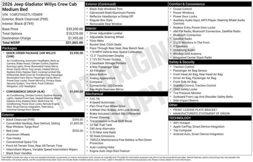 Key Chrysler Dodge Jeep Ram Newcastle is proud to present you with another True Market Priced Vehicle. This 2026 Jeep Gladiator Willys is loaded with the following Factory Options: Convenience Group (Air Conditioning with Auto Temp Control, Cluster 7.0" TFT Color Display, Corning Gorilla Glass, Daytime Running Lamp System, Emergency/Assistance Call, Front Door Locks 2-Door Passive Entry, Heated Front Seats, Heated Steering Wheel, Remote Start System, and Universal Garage Door Opener), Quick Order Package 24W Willys (2-Piece Body Color Fender Flares, 4-Wheel Drive Decal, Advanced Brake Assist, Automatic Headlamps, Auxiliary Switches, Black Grille with Gloss Black Rings, Class IV Receiver Hitch, Daytime Running Lamps LED Accents, Deep Tint Sunscreen Windows, E-Locker Rear Axle, Front Heavy Duty Red Accent Shock Absorbers, Front LED Fog Lamps, Full Speed Forward Collision Warning Plus, Heavy-Duty Engine Cooling, Increased Travel Export Tuned Suspension, LED Premium Reflector Headlamps, LED Taillamps, Mold in Color Bumper with Gloss Black, MOPAR All-Weather Slush Mats, Off-Road Plus Mode, Power Heated Mirrors, Premium Wrapped Steering Wheel, Protection Sill Rails, Rear Heavy Duty Red Accent Shock Absorbers, Security Alarm, Sun Visors with Illuminated Vanity Mirrors, Trailer Hitch Zoom, Wheels: 17" x 7.5" Painted Black, and Willys Hood Decal), 110 Mph Vehicle Max Speed Calibration, 12.3" Touchscreen Display, 3.73 Rear Axle Ratio, 4-Wheel Disc Brakes, 4G LTE Wi-Fi Hot Spot, 8 Speakers, ABS brakes, Air Conditioning, Alexa Built-in, AM/FM radio: SiriusXM with 360L, Apple CarPlay, Apple CarPlay/Android Auto, Black 3-Piece Hard Top, Brake assist, Compass, Connectivity - US/Canada, Delay-off headlights, Driver door bin, Driver vanity mirror, Dual front impact airbags, Dual front side impact airbags, Electronic Stability Control, For Details, Visit DriveUconnect.com, Freedom Panel Storage Bag, Front anti-roll bar, Front Bucket Seats, Front Center Armrest w/Storage, Front fog lights, Front License Plate Bracket, Front reading lights, Google Android Auto, Illuminated entry, Integrated Center Stack Radio, Integrated roll-over protection, Low tire pressure warning, Manufacturer's Statement of Origin, MOPAR Spray in Bedliner, Normal Duty Suspension, Occupant sensing airbag, Outside temperature display, Overhead airbag, Panic alarm, ParkView Rear Back-Up Camera, Passenger door bin, Passenger vanity mirror, Power steering, Power windows, Radio data system, Radio: Uconnect 5 with 12.3" Display, Rear anti-roll bar, Rear reading lights, Rear Sliding Window, Rear Window Defroster, Remote keyless entry, SiriusXM Radio Service, SiriusXM with 360L, Speed control, Split folding rear seat, Steering wheel mounted audio controls, Tachometer, Telescoping steering wheel, Tilt steering wheel, Traction control, Trip computer, USB Host Flip, Variably intermittent wipers, Voltmeter, and Wheels: 17" x 7.5" Black Steel Styled!!