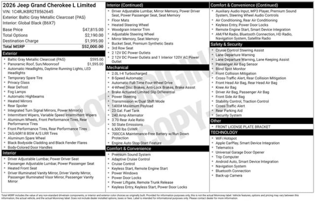 Key Chrysler Dodge Jeep Ram Newcastle is proud to present you with another True Market Priced Vehicle. This 2026 Jeep Grand Cherokee L Limited is loaded with the following Factory Options: Quick Order Package 2BE Limited, 10 Speakers, 3.70 Rear Axle Ratio, 3rd row seats: split-bench, 4-Wheel Disc Brakes, 4G LTE Wi-Fi Hot Spot, ABS brakes, Active Noise Control System, Air Conditioning, Alloy wheels, AM/FM radio: SiriusXM with 360L, Anti-whiplash front head restraints, Apple CarPlay, AppLink/Apple CarPlay and Android Auto, Audio memory, Auto High-beam Headlights, Automatic temperature control, Brake assist, Bumpers: body-color, Capri Leatherette Seats, Compass, Connectivity - US/Canada, Delay-off headlights, Disassociated Touchscreen Display, Driver door bin, Driver vanity mirror, Dual front impact airbags, Dual front side impact airbags, Dual-Pane Panoramic Sunroof, Electronic Stability Control, Emergency communication system, For Details, Visit DriveUconnect.com, Four wheel independent suspension, Front anti-roll bar, Front Bucket Seats, Front Center Armrest w/Storage, Front dual zone A/C, Front fog lights, Front License Plate Bracket, Front reading lights, Fully automatic headlights, Garage door transmitter, Global Telematics Box Module (TBM), Gloss Black Exterior Mirrors, Google Android Auto, GPS Antenna Input, Heated door mirrors, Heated Exterior Mirrors, Heated Front seats, Heated rear seats, Heated steering wheel, Illuminated entry, Integrated Center Stack Radio, Integrated Voice Command with Bluetooth, Interior Rear Facing Camera, Knee airbag, Low tire pressure warning, Manual Fold Seatbacks, Manual Folding Exterior Mirrors, Memory seat, Navigation System, Normal Duty Suspension, Occupant sensing airbag, Outside temperature display, Overhead airbag, Overhead console, Panic alarm, ParkView Rear Back-Up Camera, Passenger door bin, Passenger vanity mirror, Power door mirrors, Power driver seat, Power Fold Seatbacks, Power Liftgate, Power passenger seat, Power steering, Power windows, Radio data system, Radio: Uconnect 5 Nav with 12.3" Display, Rear air conditioning, Rear anti-roll bar, Rear reading lights, Rear window defroster, Rear window wiper, Reclining 3rd row seat, Remote keyless entry, Security system, Speed control, Speed-Sensitive Wipers, Split folding rear seat, Spoiler, Steering wheel mounted audio controls, Tachometer, Telescoping steering wheel, Tilt steering wheel, Traction control, Trip computer, Turn signal indicator mirrors, USB Host Flip, Variably intermittent wipers, Voltmeter, Wheels: 18" x 8.0" Polished/Painted Aluminum, and Wheels: 20" x 8.5" Machined/Painted Aluminum!!