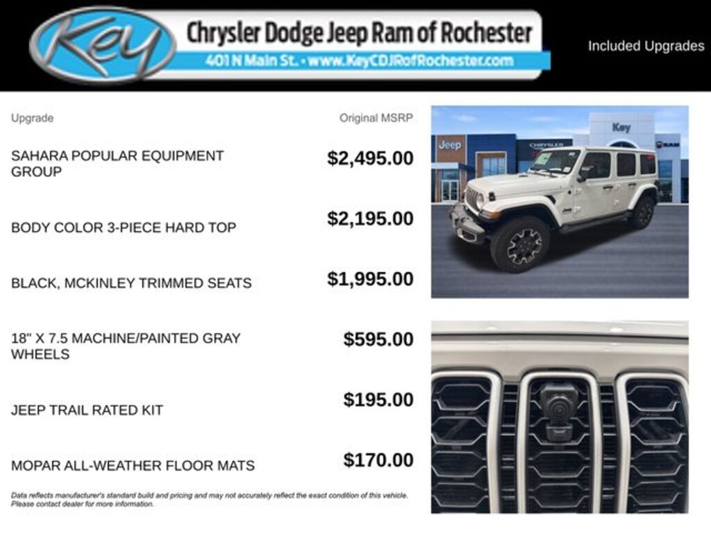 Key Chrysler Dodge Jeep Ram of Rochester is proud to present you with another True Market Priced Vehicle. This 2026 Jeep Wrangler Sahara is loaded with the following Factory Options: Quick Order Package 22G, Sahara Popular Equipment Group (12.3" Touchscreen Display, 4G LTE Wi-Fi Hot Spot, Alpine Premium Audio System, Apple CarPlay, Auto High Beam Headlamp Control, Auto-Dimming Rear-View Mirror, Blind Spot and Cross Path Detection, Connected Travel and Traffic Services, Connectivity - US/Canada, For More Info, Call 800-643-2112, Google Android Auto, GPS Navigation, Hard Seat Back, HD Radio, Integrated Center Stack Radio, Integrated Off-Road Camera, Integrated Voice Command with Bluetooth, Leather Wrapped Park Brake Handle, Leather Wrapped Shift Knob, McKinley Trimmed Seats, ParkSense Rear Park Assist System, Power 4-Way Driver Lumbar Adjust, Power 4-Way Passenger Lumbar Adjust, Power Adjust 8-Way Driver Seat, Power Adjust 8-Way Front Passenger Seat, Radio: Uconnect 5 Navigation with 12.3" Display, Side Steps, SiriusXM Radio Service, SiriusXM with 360L, and Universal Garage Door Opener), 3.45 Overall Top Gear Ratio, 4-Wheel Disc Brakes, 8 Speakers, ABS brakes, Air Conditioning, Alloy wheels, AM/FM radio: SiriusXM with 360L, Apple CarPlay/Android Auto, Automatic temperature control, Aux Battery, Body Color 3-Piece Hard Top, Brake assist, Cloth Low-Back Bucket Seats, Compass, Delay-off headlights, Driver door bin, Driver vanity mirror, Dual front impact airbags, Dual front side impact airbags, Electronic Stability Control, Emergency communication system: Jeep Connect, Freedom Panel Storage Bag, Front anti-roll bar, Front Bucket Seats, Front Center Armrest w/Storage, Front dual zone A/C, Front fog lights, Front License Plate Bracket, Front reading lights, Fully automatic headlights, Heated door mirrors, Heated front seats, Heated steering wheel, Heavy Duty Suspension with Gas Shocks, Illuminated entry, Integrated roll-over protection, Jeep Trail Rated Kit, Low tire pressure warning, MOPAR All-Weather Floor Mats, No Soft Top, Non-Lock Fuel Cap Without Discriminator, Occupant sensing airbag, Outside temperature display, Overhead airbag, Panic alarm, ParkView Rear Back-Up Camera, Passenger door bin, Passenger vanity mirror, Power door mirrors, Power steering, Power windows, Radio data system, Radio: Uconnect 5 with 12.3" Display, Rear anti-roll bar, Rear reading lights, Rear Window Defroster, Rear Window Wiper/Washer, Remote keyless entry, Security system, Speed control, Split folding rear seat, Steering wheel mounted audio controls, Stop-Start Dual Battery System, Tachometer, Telescoping steering wheel, Tilt steering wheel, Traction control, Trip computer, Variably intermittent wipers, Voltmeter, Wheels: 18" x 7.5 Machine/Painted Gray, and Wheels: 18" x 7.5" Machine/Painted Gray!! Call us to ask about conditional rebates. Price includes: $1000 - 2026 National Retail Bonus Cash . Exp. 04/30/2026 $1500 - 2026 National Select Inventory Bonus Cash . Exp. 01/04/2027