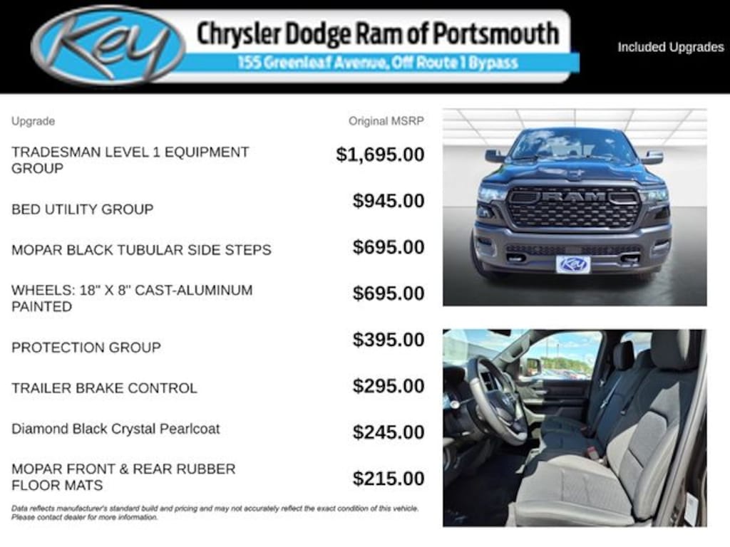 Key Chrysler Dodge Ram of Portsmouth is proud to present you with another True Market Priced Vehicle. This 2025 Ram 1500 Tradesman is loaded with the following Factory Options: ABS brakes, Active Cruise Control, Compass, Electronic Stability Control, Heated door mirrors, Illuminated entry, Low tire pressure warning, Manual Folding Exterior Mirrors, ParkView Rear Back-Up Camera, Remote keyless entry, and Traction control ABS brakes, Active Cruise Control, Compass, Electronic Stability Control, Heated door mirrors, Illuminated entry, Low tire pressure warning, Manual Folding Exterior Mirrors, ParkView Rear Back-Up Camera, Remote keyless entry, Traction control, 3.21 Rear Axle Ratio, 4 Way Front Headrests, 4-Wheel Disc Brakes, 40/20/40 Split Bench Seat, 6 Speakers, Air Conditioning, AM/FM radio, Apple CarPlay/Android Auto, Auto High-beam Headlights, Black Exterior Mirrors, Brake assist, Delay-off headlights, Driver door bin, Dual front impact airbags, Dual front side impact airbags, Exterior Mirrors w/Heating Element, Front anti-roll bar, Front Center Armrest, Front reading lights, Front wheel independent suspension, Fully automatic headlights, Heavy Duty Vinyl 40/20/40 Split Bench Seat, Manual Adjust 4-Way Driver Seat, Manual Adjust 4-Way Front Passenger Seat, Occupant sensing airbag, Outside temperature display, Overhead airbag, Overhead console, Panic alarm, Passenger door bin, Passenger vanity mirror, Power door mirrors, Power steering, Power windows, Radio data system, Radio: Uconnect 5 W w/8.4" Display, RAM Grille Badge - Black, Rear anti-roll bar, Rear step bumper, Speed control, Tachometer, Telescoping steering wheel, Tilt steering wheel, Variably intermittent wipers, Voltmeter, and Wheels: 18" x 7.5" Steel Painted!!