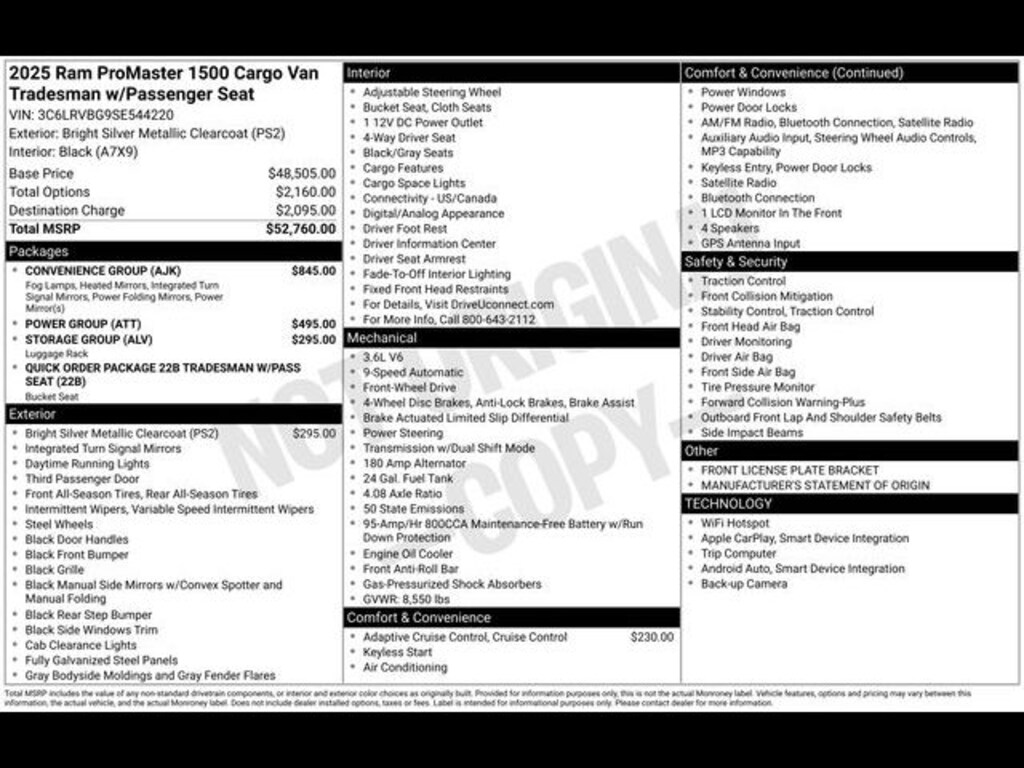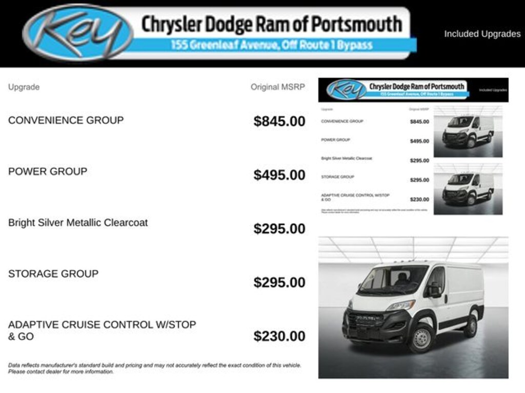 Key Chrysler Dodge Ram of Portsmouth is proud to present you with another True Market Priced Vehicle. This 2025 Ram ProMaster 1500 is loaded with the following Factory Options: Convenience Group (Exterior Mirrors w/Heating Element, Exterior Mirrors w/Supplemental Signals, Front Fog Lamps, Power Adjust Mirrors, Power Folding/Heated Mirrors, Power-Adjustable Convex Aux Mirrors, Power-Folding Mirrors, and Rear Cargo LED Lamp), Power Group (100 Amp Battery, 115V Auxiliary Power Outlet, and 12V Rear Auxiliary Power Outlet), Quick Order Package 22B Tradesman w/Pass Seat (4-Way Manual Adjust Front Passenger Seat and Passenger Bucket Seat), Storage Group (Cargo Net, Shelf Above Roof Trim, and Underseat Storage Tray), 4 Speakers, 4-Wheel Disc Brakes, 4.08 Axle Ratio, 4G LTE Wi-Fi Hotspot, ABS brakes, Adaptive Cruise Control w/Stop & Go, Air Conditioning, AM/FM radio: SiriusXM, Apple CarPlay, Apple CarPlay/Android Auto, Black/Gray Seats, Bodyside moldings, Brake assist, Cloth Bucket Seats, Connectivity - US/Canada, Driver door bin, Driver Seat Armrest, Driver's Seat Mounted Armrest, Electronic Stability Control, For Details, Visit DriveUconnect.com, For More Info, Call 800-643-2112, Front anti-roll bar, Front Bucket Seats, Front License Plate Bracket, Front reading lights, Front wheel independent suspension, Global Telematics Box Module (TBM), Google Android Auto, GPS Antenna Input, Illuminated entry, Low tire pressure warning, Manufacturer's Statement of Origin, Medium Duty Suspension, Outside temperature display, Overhead airbag, Overhead console, ParkView Rear Back-Up Camera, Passenger door bin, Power steering, Power windows, Radio: Uconnect 5 w/7" Display, Remote keyless entry, SiriusXM Radio Service, Steering wheel mounted audio controls, Tachometer, Telescoping steering wheel, Traction control, Trip computer, Turn signal indicator mirrors, Variably intermittent wipers, Wheel Center Cap, and Wheels: 16" x 6.0" Steel!!