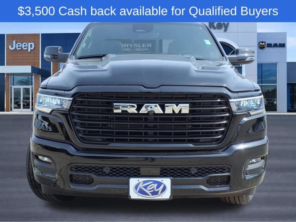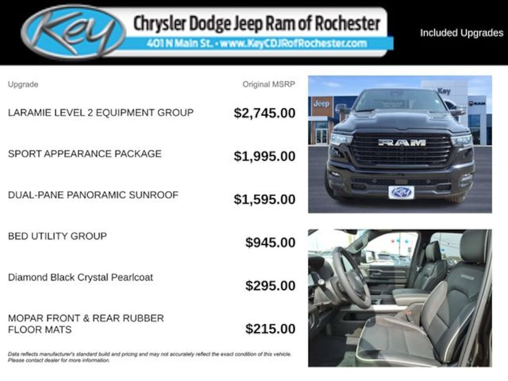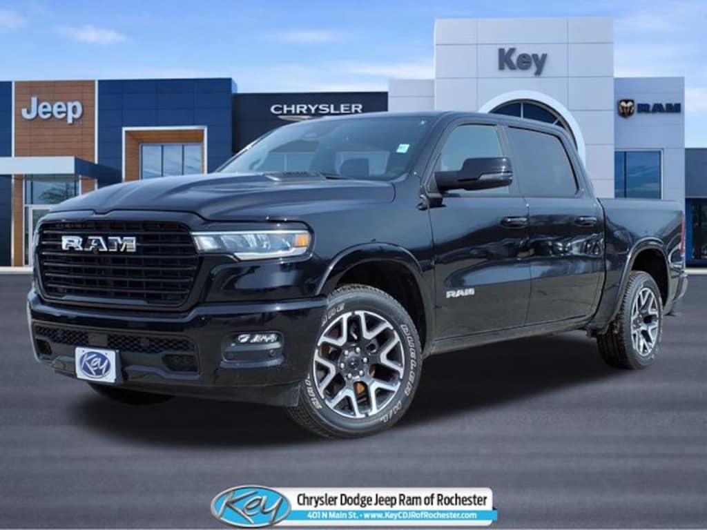 Key Chrysler Dodge Jeep Ram of Rochester is proud to present you with another True Market Priced Vehicle. This 2026 Ram 1500 Laramie is loaded with the following Factory Options: Bed Utility Group (Exterior 115V AC Outlet, MOPAR 4 Adjustable Cargo Tie-Down Hooks, and MOPAR Spray in Bedliner), Laramie Level 2 Equipment Group (14.4" Touchscreen Display, 4G LTE Wi-Fi Hot Spot, Cluster 12" TFT Color Display, Connected Travel and Traffic Services, Connectivity - US/Canada, Front Passenger Interactive Display, GPS Navigation, Harman/Kardon 19 Speaker Premium Sound, Integrated Center Stack Radio, Integrated Voice Command with Bluetooth, Power Tailgate, Radio: Uconnect 5 Nav with 14.4" Display, Rain Sensitive Windshield Wipers, SiriusXM Radio Service, SiriusXM with 360L, and USB Host Flip), Quick Order Package 21H Laramie, Sport Appearance Package (Accent Color Premium Power Mirrors, Auto Power-Folding Mirrors, Auto-Dimming Exterior Driver Mirror, Black Interior Accents, Black Painted Exterior Mirrors Caps, Body Color Front Bumper, Body Color Rear Bumper with Step Pads, Bridgestone Brand Tires, Convex Wide-Angle Exterior Mirror Insert, Exterior Mirrors Courtesy Lamps, Exterior Mirrors with Heating Element, Exterior Mirrors with Memory, Exterior Mirrors with Supplemental Signals, Grille Surround 3 Body Color Tex 2 Black, RAM Grille Badge - Chrome, and Sport Performance Hood), 10 Speakers, 3.55 Rear Axle Ratio, 4-Wheel Disc Brakes, ABS brakes, Active Noise Control System, Adjustable pedals, Air Conditioning, Alloy wheels, AM/FM radio: SiriusXM with 360L, Apple CarPlay/Android Auto, Audio memory, Auto High-beam Headlights, Auto-dimming door mirrors, Auto-dimming Rear-View mirror, Automatic temperature control, Brake assist, Bumpers: chrome, Chrome Exterior Mirrors, Compass, Delay-off headlights, Dome Dual LED Reading Lamp, Driver door bin, Driver vanity mirror, Dual front impact airbags, Dual front side impact airbags, Dual-Pane Panoramic Sunroof, Electronic Stability Control, Front anti-roll bar, Front Bucket Seats, Front Center Armrest w/Storage, Front dual zone A/C, Front fog lights, Front License Plate Bracket, Front reading lights, Front wheel independent suspension, Fully automatic headlights, Garage door transmitter, Heated door mirrors, Heated front seats, Heated rear seats, Heated steering wheel, Illuminated entry, Leather steering wheel, Leather Trimmed Bucket Seats, LED Dome/Reading Lamp, Low tire pressure warning, Manufacturer's Statement of Origin, Memory seat, MOPAR Front and Rear Rubber Floor Mats, Navigation System, Occupant sensing airbag, Off-Road Information Pages, Outside temperature display, Overhead airbag, Overhead console, Panic alarm, ParkView Rear Back-Up Camera, Passenger door bin, Passenger vanity mirror, Pedal memory, Power door mirrors, Power driver seat, Power passenger seat, Power steering, Power windows, Radio data system, Radio: Uconnect 5 Navigation with 12.0" Display, Rear anti-roll bar, Rear reading lights, Rear seat center armrest, Rear step bumper, Remote keyless entry, Securit Call us to ask about conditional rebates. Price includes: $3500 - 2026 National Retail Bonu