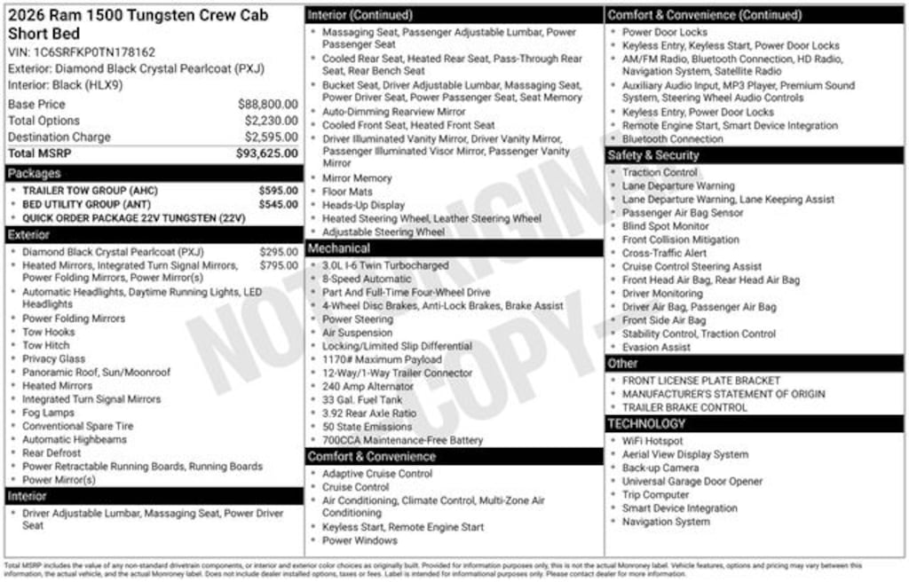 Key Chrysler Dodge Jeep Ram Newcastle is proud to present you with another True Market Priced Vehicle. This 2026 Ram 1500 Tungsten is loaded with the following Factory Options: Bed Utility Group (Exterior 115V AC Outlet, MOPAR 4 Adjustable Cargo Tie-Down Hooks, and Truck Bed Cargo Divider), Quick Order Package 22V Tungsten, Trailer Tow Group (Trailer Brake Control, Trailer Light Check, Trailer Reverse Steering Control, and Trailer Tire Pressure Monitoring System), 12-Way/1-Way Trailer Connector, 3.92 Rear Axle Ratio, 4-Wheel Disc Brakes, ABS brakes, Adjustable pedals, Air Conditioning, Alloy wheels, AM/FM radio, Apple CarPlay/Android Auto, Audio memory, Auto High-beam Headlights, Auto Power-Folding Mirrors, Auto-dimming door mirrors, Auto-Dimming Exterior Driver Mirror, Auto-Dimming Exterior Passenger Mirror, Auto-dimming Rear-View mirror, Auto-leveling suspension, Automatic temperature control, Bodyside moldings, Brake assist, Bumpers: body-color, Chrome Exterior Mirrors, Chrome Power-Fold Trailer Tow Mirrors, Compass, Delay-off headlights, Driver door bin, Driver vanity mirror, Dual front impact airbags, Dual front side impact airbags, Electronic Stability Control, Exterior Mirrors Courtesy Lamps, Exterior Mirrors with Heating Element, Exterior Mirrors with Memory, Exterior Mirrors with Supplemental Signals, Exterior Parking Camera Rear, Forward and Reverse Utility Lights, Front anti-roll bar, Front Bucket Seats, Front Center Armrest w/Storage, Front dual zone A/C, Front fog lights, Front License Plate Bracket, Front reading lights, Front wheel independent suspension, Fully automatic headlights, Garage door transmitter, Heads-Up Display, Heated door mirrors, Heated Front seats, Heated rear seats, Heated steering wheel, Illuminated entry, Leather steering wheel, Low tire pressure warning, Manufacturer's Statement of Origin, Memory seat, Mirror Clearance/Running Lights, Navigation System, Occupant sensing airbag, Outside temperature display, Overhead airbag, Overhead console, Panic alarm, Passenger door bin, Passenger vanity mirror, Pedal memory, Power adjustable front head restraints, Power door mirrors, Power driver seat, Power moonroof, Power passenger seat, Power steering, Power Telescoping Mirrors, Power windows, Power-Adjustable Convex Aux Mirrors, Premium Leather Bucket Seats, Radio data system, Radio: Uconnect 5 Nav with 14.4" Display, Rain sensing wipers, Rear anti-roll bar, Rear reading lights, Rear seat center armrest, Rear step bumper, Rear window defroster, Remote keyless entry, Security system, Speed control, Split folding rear seat, Steering wheel mounted audio controls, Tachometer, Telescoping steering wheel, Tilt steering wheel, Traction control, Trailer Tow Mirrors, Trip computer, Turn signal indicator mirrors, Variably intermittent wipers, Ventilated front seats, Ventilated rear seats, Voltmeter, and Wheels: 22" x 9" Polish/Painted with Inserts!!