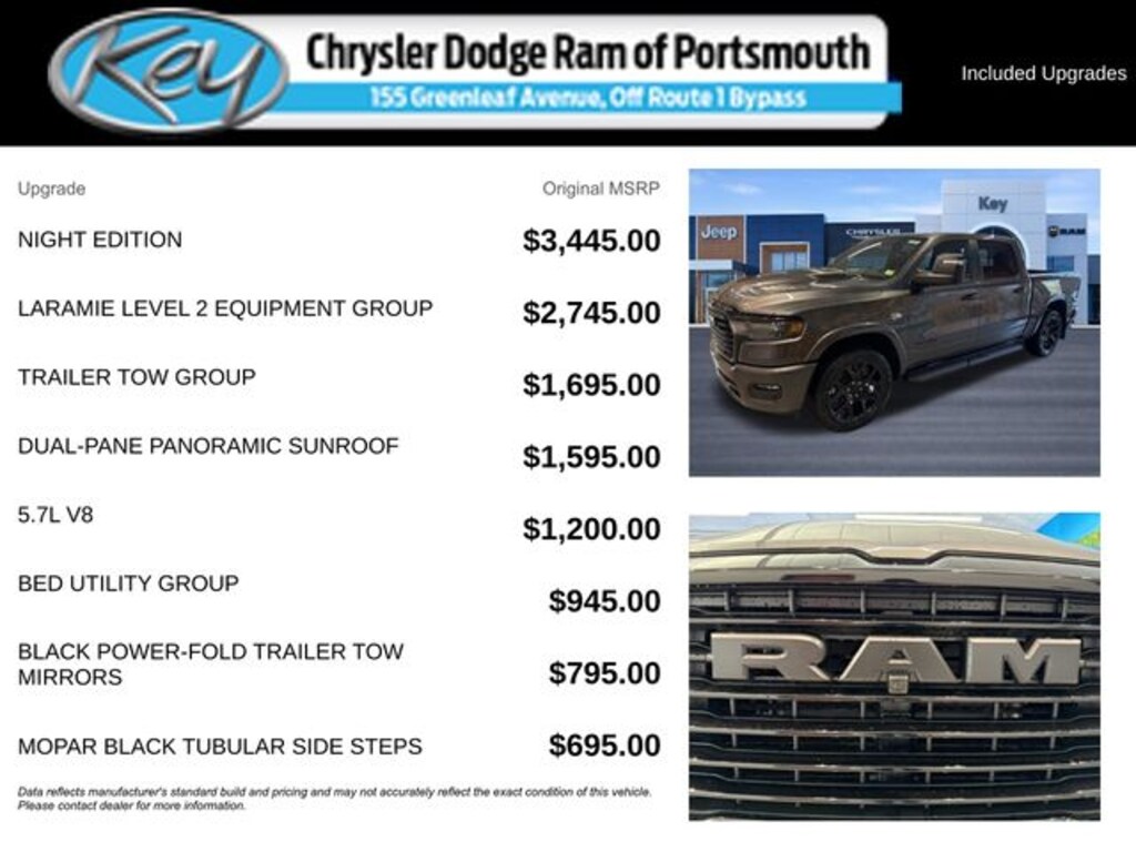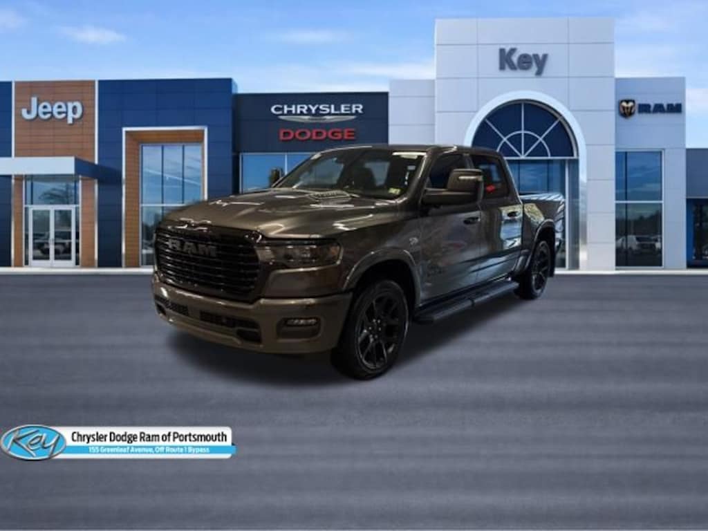 Key Chrysler Dodge Ram of Portsmouth is proud to present you with another True Market Priced Vehicle. This 2026 Ram 1500 Laramie is loaded with the following Factory Options: Bed Utility Group (Exterior 115V AC Outlet, MOPAR 4 Adjustable Cargo Tie-Down Hooks, and MOPAR Spray in Bedliner), Laramie Level 2 Equipment Group (14.4" Touchscreen Display, 4G LTE Wi-Fi Hot Spot, Cluster 12" TFT Color Display, Connected Travel and Traffic Services, Connectivity - US/Canada, Front Passenger Interactive Display, GPS Navigation, Harman/Kardon 19 Speaker Premium Sound, Integrated Center Stack Radio, Integrated Voice Command with Bluetooth, Power Tailgate, Radio: Uconnect 5 Nav with 14.4" Display, Rain Sensitive Windshield Wipers, SiriusXM Radio Service, SiriusXM with 360L, and USB Host Flip), Night Edition (Accent Color Door Handles, Accent Color Premium Power Mirrors, Accent Color Tailgate Handle, Anti-Spin Differential Rear Axle, Auto Power-Folding Mirrors, Auto-Dimming Exterior Driver Mirror, Black Exterior Truck Badging, Black Headlamp Bezels, Black Interior Accents, Black Painted Exterior Mirrors Caps, Black Tail Lamp Bezels, Body Color Front Bumper, Body Color Rear Bumper with Step Pads, Convex Wide-Angle Exterior Mirror Insert, Dual Exhaust with Black Tips, Exterior Mirrors Approach Lamps, Exterior Mirrors Courtesy Lamps, Exterior Mirrors with Heating Element, Exterior Mirrors with Memory, Exterior Mirrors with Supplemental Signals, Grille Surround 3 Black Texture 2 Black, Pirelli Brand Tires, Proximity Approach/Departure Lamps, RAM Grille Badge - Black, Sport Performance Hood, and Wheels: 22" x 9" Forged Aluminum), Quick Order Package 27H Laramie, Trailer Tow Group (Trailer Brake Control, Trailer Reverse Steering Control, and Trailer Tire Pressure Monitoring System), 10 Speakers, 4-Wheel Disc Brakes, ABS brakes, Active Noise Control System, Adjustable pedals, Air Conditioning, Alloy wheels, AM/FM radio: SiriusXM with 360L, Apple CarPlay/Android Auto, Audio memory, Auto High-beam Headlights, Auto-dimming door mirrors, Auto-Dimming Exterior Passenger Mirror, Auto-dimming Rear-View mirror, Automatic temperature control, Black Exterior Mirrors, Black Power-Fold Trailer Tow Mirrors, Brake assist, Bumpers: chrome, Chrome Exterior Mirrors, Compass, Delay-off headlights, Dome Dual LED Reading Lamp, Driver door bin, Driver vanity mirror, Dual front impact airbags, Dual front side impact airbags, Dual-Pane Panoramic Sunroof, Electronic Stability Control, Forward and Reverse Utility Lights, Front anti-roll bar, Front Bucket Seats, Front Center Armrest w/Storage, Front dual zone A/C, Front fog lights, Front License Plate Bracket, Front reading lights, Front wheel independent suspension, Fully automatic headlights, Garage door transmitter, Heated door mirrors, Heated front seats, Heated rear seats, Heated steering wheel, Illuminated entry, Leather steering
