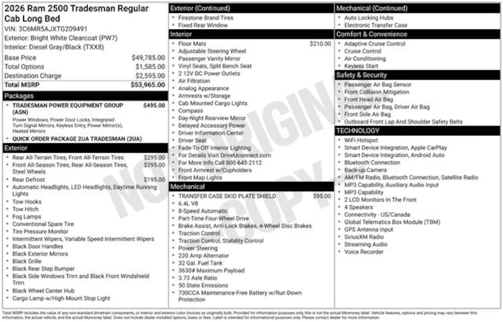 Key Chrysler Dodge Jeep Ram of Rochester is proud to present you with another True Market Priced Vehicle. This 2026 Ram 2500 Tradesman is loaded with the following Factory Options: Quick Order Package 2UA Tradesman, Tradesman Power Equipment Group (Black Exterior Mirrors, Exterior Mirrors Courtesy Lamps, Exterior Mirrors with Heating Element, Exterior Mirrors with Supplemental Signals, Front 1-Touch Down Power Windows, Manual Folding Exterior Mirrors, Manual Telescoping Mirrors, Mirror Running Lights, Power Adjust Mirrors, Power Heated Folding Telescopic Mirrors, Power-Adjustable Convex Aux Mirrors, Remote Keyless Entry, Speed Sensitive Power Locks, and Upgraded Door Trim Panel), 3.73 Axle Ratio, 4 Speakers, 4-Wheel Disc Brakes, 40/20/40 Split Bench Seat, 4G LTE Wi-Fi Hot Spot, ABS brakes, Air Conditioning, AM/FM radio: SiriusXM, Apple CarPlay, Apple CarPlay/Android Auto, Black Wheel Center Hub, Brake assist, Compass, Connectivity - US/Canada, Delay-off headlights, Driver door bin, Dual front impact airbags, Dual front side impact airbags, Electronic Stability Control, For Details Visit DriveUconnect.com, For More Info Call 800-643-2112, Front anti-roll bar, Front Armrest with Cupholders, Front Center Armrest w/Storage, Front fog lights, Front License Plate Bracket, Front reading lights, Fully automatic headlights, Global Telematics Box Module, Google Android Auto, GPS Antenna Input, Heavy Duty Vinyl 40/20/40 Split Bench Seat, Illuminated entry, Integrated Voice Command with Bluetooth, Low tire pressure warning, Manual Adjust 4-Way Driver Seat, Manual Adjust 4-Way Front Passenger Seat, MOPAR Front Rubber Floor Mats, Occupant sensing airbag, Outside temperature display, Overhead airbag, Overhead console, ParkView Rear Back-Up Camera, Passenger door bin, Passenger vanity mirror, Power steering, Radio data system, Radio: Uconnect 5 with 8.4" Display, Rear anti-roll bar, Rear step bumper, Rear Window Defroster, Remote USB Port - Charge Only, Selectable Tire Fill Alert, SiriusXM Radio Service, Speed control, Tachometer, Tilt steering wheel, Traction control, Variably intermittent wipers, Voltmeter, Wheels: 17" x 7.5" Black Steel Styled, and Wheels: 18" x 8.0" Black Painted Steel!!
