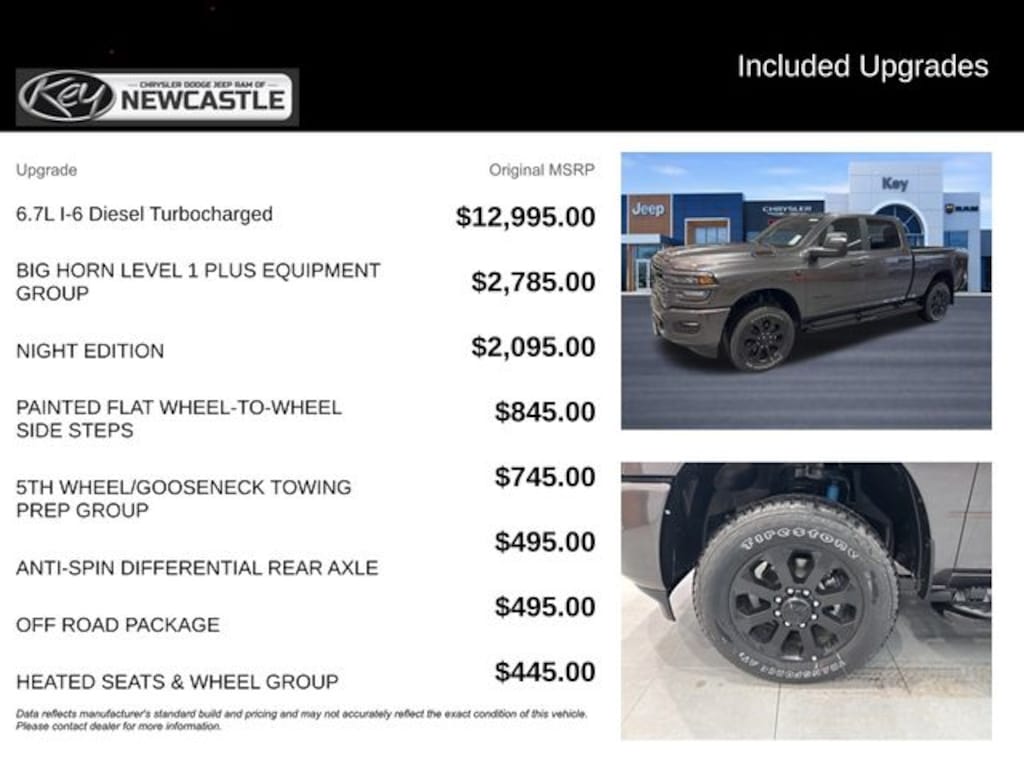 Key Chrysler Dodge Jeep Ram Newcastle is proud to present you with another True Market Priced Vehicle. This 2026 Ram 2500 Big Horn is loaded with the following Factory Options: Big Horn Level 1 Plus Equipment Group (12" Touchscreen Display, 2 Way Rear Headrest Seat, 2nd Row in Floor Storage Bins, 4 Way Front Headrests, 40/20/40 Split Bench Seat, 4G LTE Wi-Fi Hot Spot, 9 Alpine Speakers with Subwoofer, Air Conditioning ATC with Dual Zone Control, Alexa Built-in, Anti-Spin Differential Rear Axle, Apple CarPlay, Auto Power-Folding Mirrors, Auto-Dimming Rear-View Mirror, Black Exterior Mirrors, Connected Travel and Traffic Services, Connectivity - US/Canada, Disassociated Touchscreen Display, Dual Glove Boxes, Emergency Vehicle Alert System (EVAS), Exterior Mirrors Courtesy Lamps, Exterior Mirrors with Heating Element, Exterior Mirrors with Supplemental Signals, Foam Bottle Insert (door Trim Panel), Folding Flat Load Floor Storage, Footwell Courtesy Lamp, For Details, Visit DriveUconnect.com, For More Info, Call 800-643-2112, Forward and Reverse Utility Lights, Front Armrest with Cupholders, Front Center Seat Cushion Storage, Front Seat Back Map Pockets, Global Telematics Box Module, Glove Box Lamp, Google Android Auto, GPS Antenna Input, GPS Navigation, HD Radio, Integrated Voice Command with Bluetooth, LED Bed Lighting, Locking Lower Glove Box, Luxury Steering Wheel, Manual Adjust 4-Way Front Passenger Seat, Mirror Running Lights, MOPAR Deployable Bed Step, MOPAR Spray in Bedliner, Off-Road Info Pages, Power 2-Way Driver Lumbar Adjust, Power Adjust 8-Way Driver Seat, Power Adjust Mirrors, Power Heated Folding Telescopic Mirrors, Power Telescoping Mirrors, Power-Adjustable Convex Aux Mirrors, Premium Cloth 40/20/40 Bench Seat, Radio: Uconnect 5 Navigation with 12.0" Display, Rear 60/40 Folding Seat, Rear Dome with on/Off Switch Lamp, Remote Start System, Remote USB Port - Charge Only, Selectable Tire Fill Alert, SiriusXM Radio Service, SiriusXM with 360L, Steering Wheel Mounted Audio Controls, Storage Tray, and Trailer Tow Pages), Heated Seats and Wheel Group (Heated Front Seats and Heated Steering Wheel), Night Edition (Black Exterior Truck Badging, Black Interior Accents, Black Wheel Center Hub, Body Color Grille-Surround, Gloss Black Nostrils/Mic Black Grille, Painted Front Bumper, Painted Rear Bumper, and Wheels: 20" x 8.0" Black Painted Aluminum), Off Road Package (Front Performance Tuned Shock Absorbers, Hill Descent Control, and Rear Performance Tuned Shock Absorbers), Quick Order Package 24Z Big Horn, 4-Wheel Disc Brakes, 5th Wheel/Gooseneck Towing Prep Group, 6 Speakers, ABS brakes, Air Conditioning, Alloy wheels, AM/FM radio: SiriusXM, Apple CarPlay/Android Auto, Brake assist, Bumpers: chrome, Center Hub, Clearance Lamps, Cloth 40/20/40 Bench Seat, Compass, Delay-off headlights, Driver door bin, Dual front impact airbags, Dual front side impact airbags, Electronic Stability Control, Front anti-roll bar, Front Center Armrest w/Storage, Front fog lights, Front License Plate Bracket, Front reading lights, Fully automatic headlights, Heated door mirrors, Illuminated entry, Low tire pressure warning, Manual Adjust 4-Way Driver Seat, Manufacturer's Statement of Origin, MOPAR Front and Rear Rubber Floor Mats, Occupant sensing airbag, Outside temperature display, Overhead airbag, Overhead console, Painted Flat Wheel-to-Wheel Side Steps, Panic a