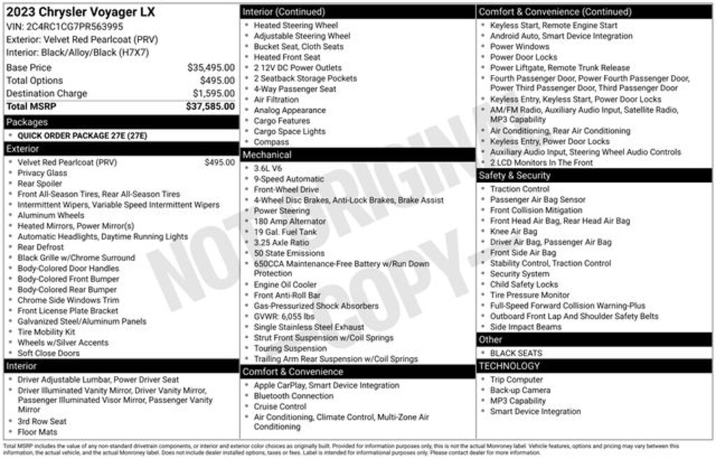 2023 Chrysler Voyager LX Velvet Red Pearlcoat 4D Passenger Van LX 3.6L V6 24V VVT 9-Speed 948TE Automatic FWD