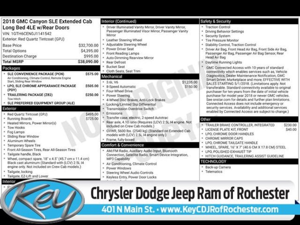 Key Chrysler Dodge Jeep Ram of Rochester is proud to present you with another True Market Priced Pre-Owned Vehicle. Transparent Pricing Of $ 19995 !! This 2018 GMC Canyon SLE1 is loaded with the following Factory Options: 4WD Trailering Package, 4WD, 3.42 Rear Axle Ratio, 4-Way Power Front Passenger Seat Adjuster, 4-Wheel Disc Brakes, 5" Rectangular Chrome Assist Steps (LPO), 6 Speakers, ABS brakes, Air Conditioning, All-Weather Floor Liner (LPO), Alloy wheels, AM/FM radio: SiriusXM, Auto-dimming Rear-View mirror, Bumpers: body-color, Cloth Seat Trim, Compass, Delay-off headlights, Driver 4-Way Power Seat Adjuster, Driver door bin, Driver vanity mirror, Dual front impact airbags, Dual front side impact airbags, Electronic Stability Control, Exterior Parking Camera Rear, Front anti-roll bar, Front Bucket Seats, Front Center Armrest, Front fog lights, Front License Plate Kit, Front reading lights, Front wheel independent suspension, Fully automatic headlights, Heated door mirrors, Heated Driver & Front Passenger Seats, Illuminated entry, Integrated Trailer Brake Controller, Low tire pressure warning, Occupant sensing airbag, Outside temperature display, Overhead airbag, Overhead console, Panic alarm, Passenger door bin, Passenger vanity mirror, Polished Exhaust Tip, Power door mirrors, Power Driver Lumbar Control Seat Adjuster, Power driver seat, Power Passenger Lumbar Control Seat Adjuster, Power steering, Power windows, Premium audio system: GMC Infotainment System, Radio data system, Radio: AM/FM Stereo w/8" Color Touch Screen, Rear step bumper, Rear window defroster, Remote keyless entry, Security system, SiriusXM Satellite Radio, Speed control, Speed-sensing steering, Split folding rear seat, Steering wheel mounted audio controls, Tachometer, Telescoping steering wheel, Tilt steering wheel, Tow/Haul Mode, Traction control, Trailering Assist Guideline Hitch Guidance, Trip computer, and Variably intermittent wipers!!