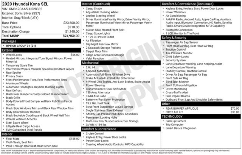 Key Chrysler Dodge Jeep Ram of Rochester is proud to present you with another True Market Priced Pre-Owned Vehicle. Transparent Pricing Of $ !! This 2020 Hyundai Kona SEL is loaded with the following Factory Options: Option Group 01, 3.648 Axle Ratio, 4-Wheel Disc Brakes, 6 Speakers, ABS brakes, Air Conditioning, Alloy wheels, AM/FM radio: SiriusXM, Apple CarPlay & Android Auto, Brake assist, Bumpers: body-color, Carpeted Floor Mats, Cloth Seat Trim, Delay-off headlights, Driver door bin, Driver vanity mirror, Dual front impact airbags, Dual front side impact airbags, Electronic Stability Control, Exterior Parking Camera Rear, First Aid Kit, Four wheel independent suspension, Front anti-roll bar, Front Bucket Seats, Front Center Armrest, Front reading lights, Fully automatic headlights, Heated door mirrors, Heated Front Bucket Seats, Heated front seats, Illuminated entry, Leather Shift Knob, Leather steering wheel, Low tire pressure warning, Occupant sensing airbag, Outside temperature display, Overhead airbag, Overhead console, Panic alarm, Passenger door bin, Passenger vanity mirror, Power door mirrors, Power steering, Power windows, Radio: AM/FM/MP3/HD Radio/SiriusXM Audio System, Rear anti-roll bar, Rear Bumper Applique, Rear seat center armrest, Rear window defroster, Rear window wiper, Remote keyless entry, Roof rack: rails only, Security system, Speed control, Speed-sensing steering, Split folding rear seat, Spoiler, Steering wheel mounted audio controls, Tachometer, Telescoping steering wheel, Tilt steering wheel, Traction control, Trip computer, Turn signal indicator mirrors, Variably intermittent wipers, Wheel Locks, and Wheels: 17 x 7.0J Alloy!!