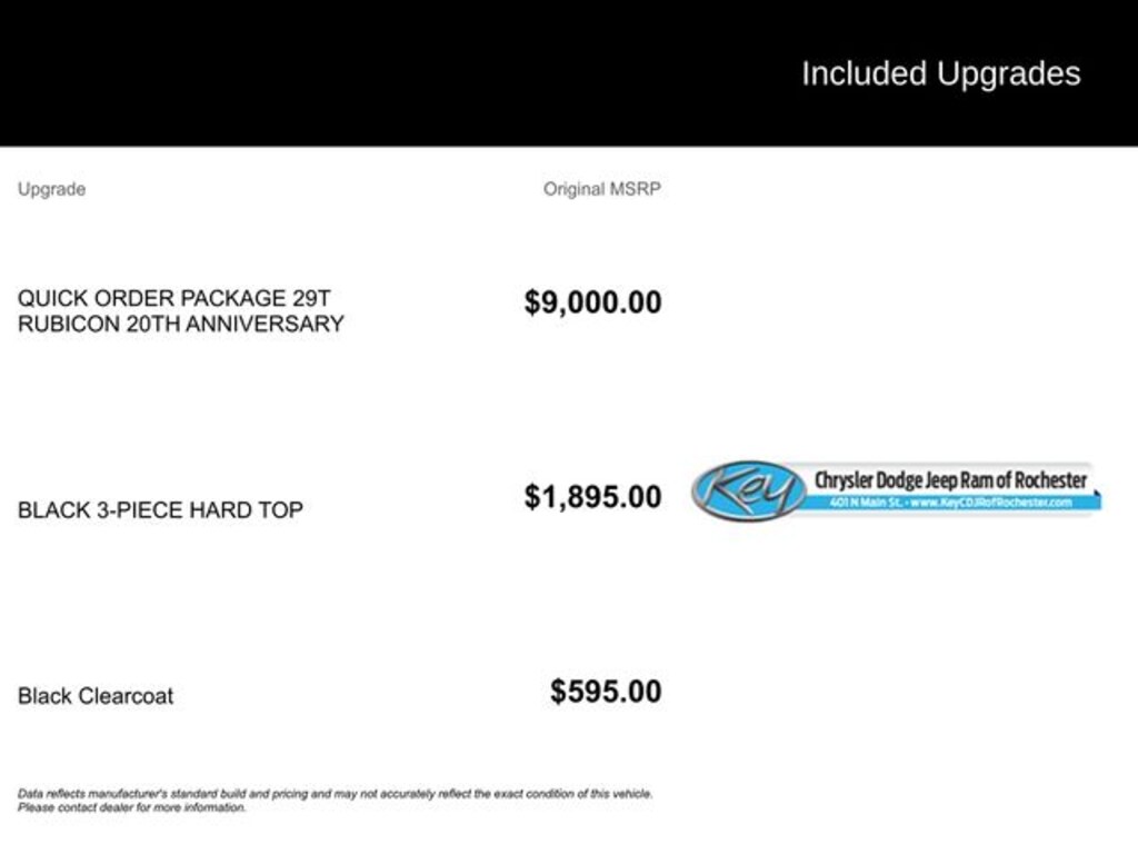 Key Chrysler Dodge Jeep Ram of Rochester is proud to present you with another True Market Priced Pre-Owned Vehicle. Transparent Pricing Of $ !! This 2023 Jeep Wrangler is loaded with the following Factory Options: 2.0L I4 DOHC Quick Order Package 29T Rubicon 20th Anniversary (#1 Seat Foam Cushion, 20th Anniversary Rubicon 4xe Suspension, Corning Gorilla Glass, Integrated Off-Road Camera, Leather Wrapped Park Brake Handle, Leather Wrapped Shift Knob, MOPAR 3 Bar Bumper Hoop, MOPAR All-Weather Floor Mats, MOPAR Rubicon 20th Anniversary Tool Kit, Nappa Leather Seats, Premium Door Trim Panel, Premium Wrapped Red I/P Bezels, Red Interior Accents, Red Seat Belt, Rubicon 20th Anniversary, Rubicon 20th Anniversary Grille, Rubicon 20th Anniversary Shifter Medallion, Rubicon 20th Anniversary Side Hood Decal 4xe, Rubicon 20th Anniversary Swing Gate Plaque, Rubicon 20th Anniversary Top Hood Decal 4xe, and Wheels: 17" x 7.5" Black Beadlock Capable), Steel Bumper Group (Steel Front Bumper and Steel Rear Bumper), Trailer Tow & Aux Switch Group (7 & 4 Pin Wiring Harness, 700 Amp Maintenance Free Battery, Auxiliary Switches, and Class II Receiver Hitch), 2.0L I4 DOHC, 4-Wheel Disc Brakes, 4.10 Rear Axle Ratio, 9 Speakers, ABS brakes, Air Conditioning, Alloy wheels, AM/FM radio: SiriusXM, Apple CarPlay/Android Auto, Auto-dimming Rear-View mirror, Automatic temperature control, Black 3-Piece Hard Top, Brake assist, Compass, Delay-off headlights, Driver door bin, Driver vanity mirror, Dual front impact airbags, Dual front side impact airbags, Electronic Stability Control, Emergency communication system: SiriusXM Guardian, Freedom Panel Storage Bag, Front anti-roll bar, Front Bucket Seats, Front Center Armrest w/Storage, Front dual zone A/C, Front fog lights, Front License Plate Bracket, Front reading lights, Fully automatic headlights, Garage door transmitter, Heated door mirrors, Illuminated entry, Integrated roll-over protection, Low tire pressure warning, Navigation System, Occupant sensing airbag, Outside temperature display, Panic alarm, ParkView Rear Back-Up Camera, Passenger door bin, Passenger vanity mirror, Performance Suspension, Power door mirrors, Power steering, Power windows, Premium Cloth Low-Back Bucket Seats, Radio data system, Radio: Uconnect 4C Nav w/8.4" Display, Rear anti-roll bar, Rear reading lights, Rear Window Defroster, Rear Window Wiper/Washer, Remote keyless entry, Security system, Speed control, Split folding rear seat, Steering wheel mounted audio controls, Tachometer, Telescoping steering wheel, Tilt steering wheel, Traction control, Trip computer, Variably intermittent wipers, Voltmeter, and Wheels: 17" x 7.5" Machined w/Black Pockets!!